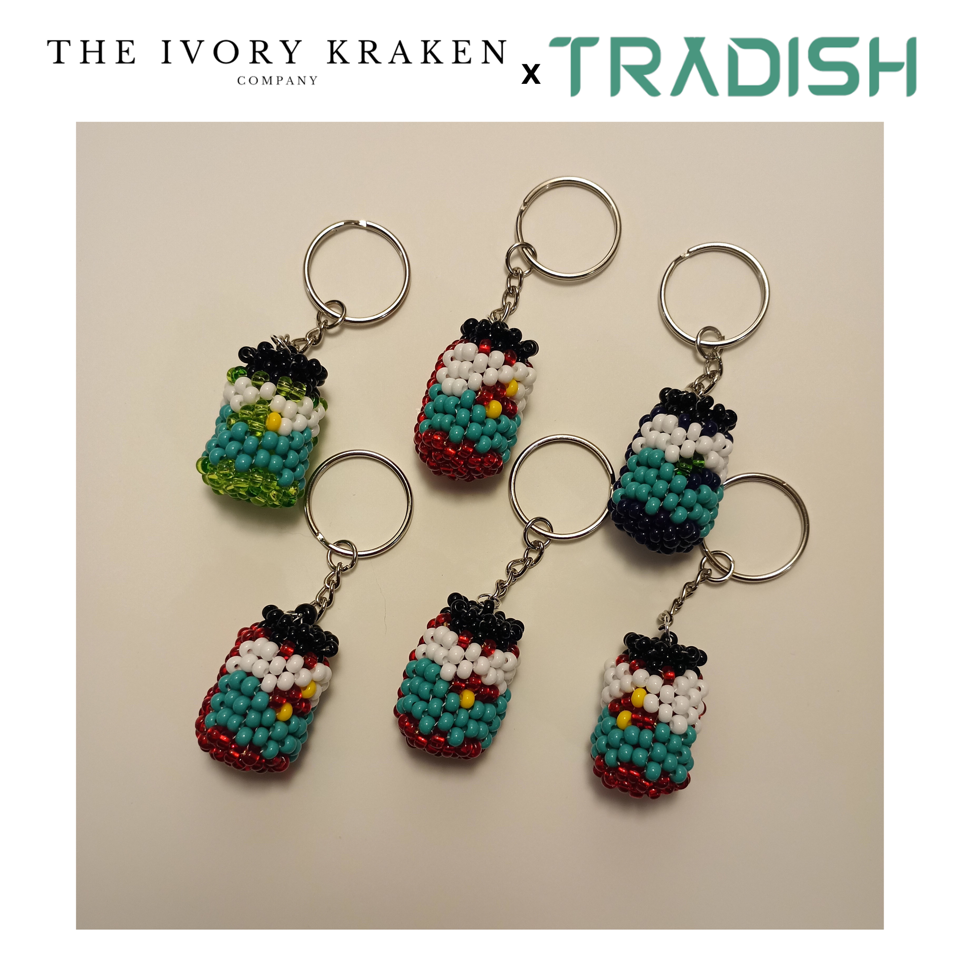 Details • Hand-beaded jam jar design • Made by hand • Durable keychain hardware • A special collaboration between The Ivory Kraken Company and Tradish Ancestor Café